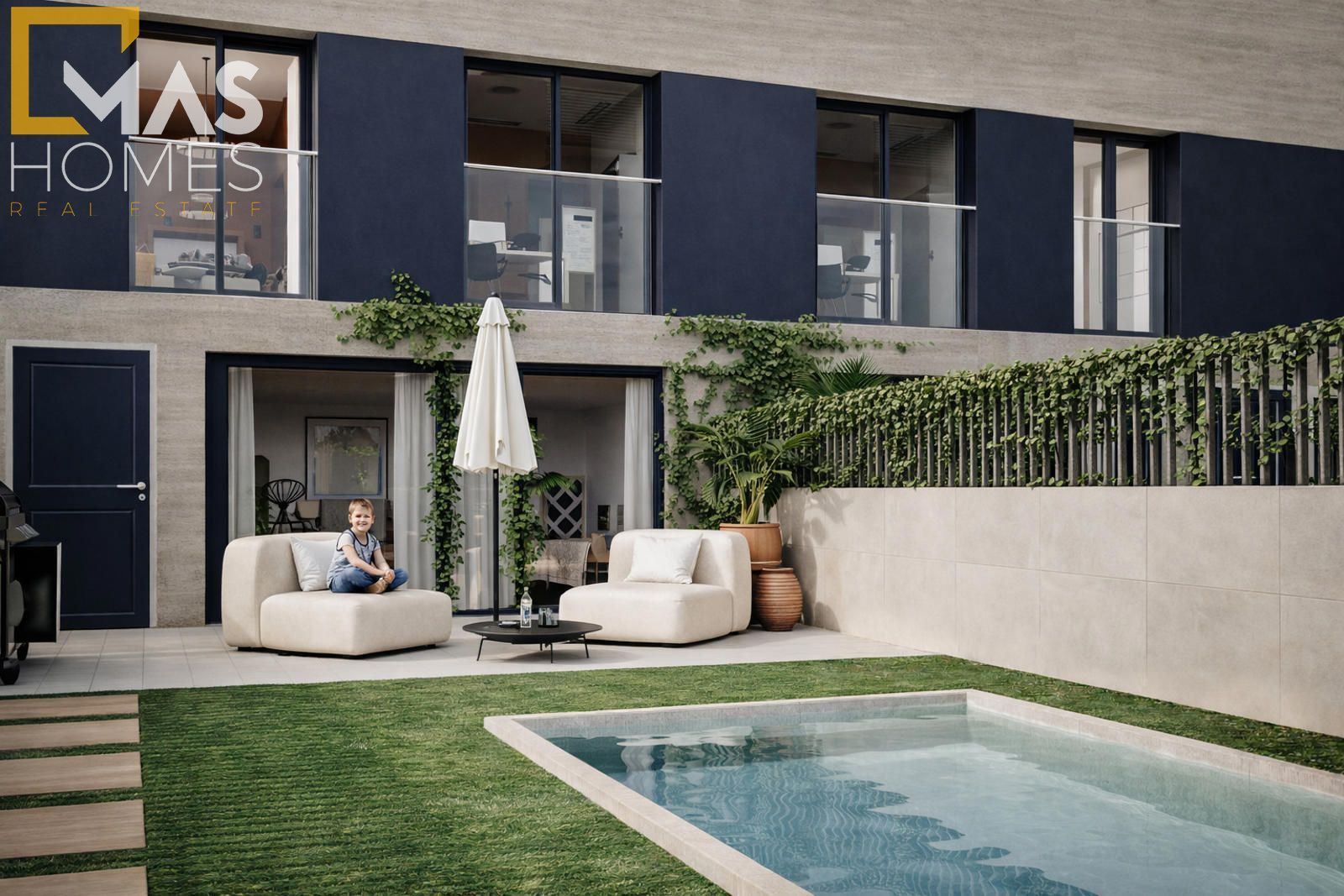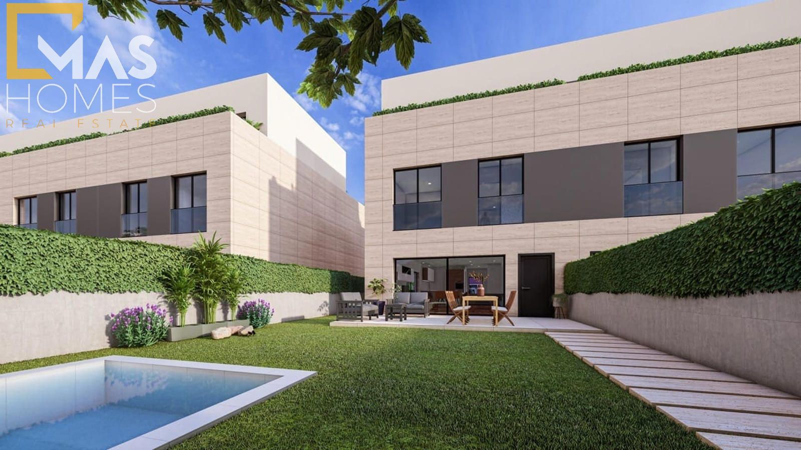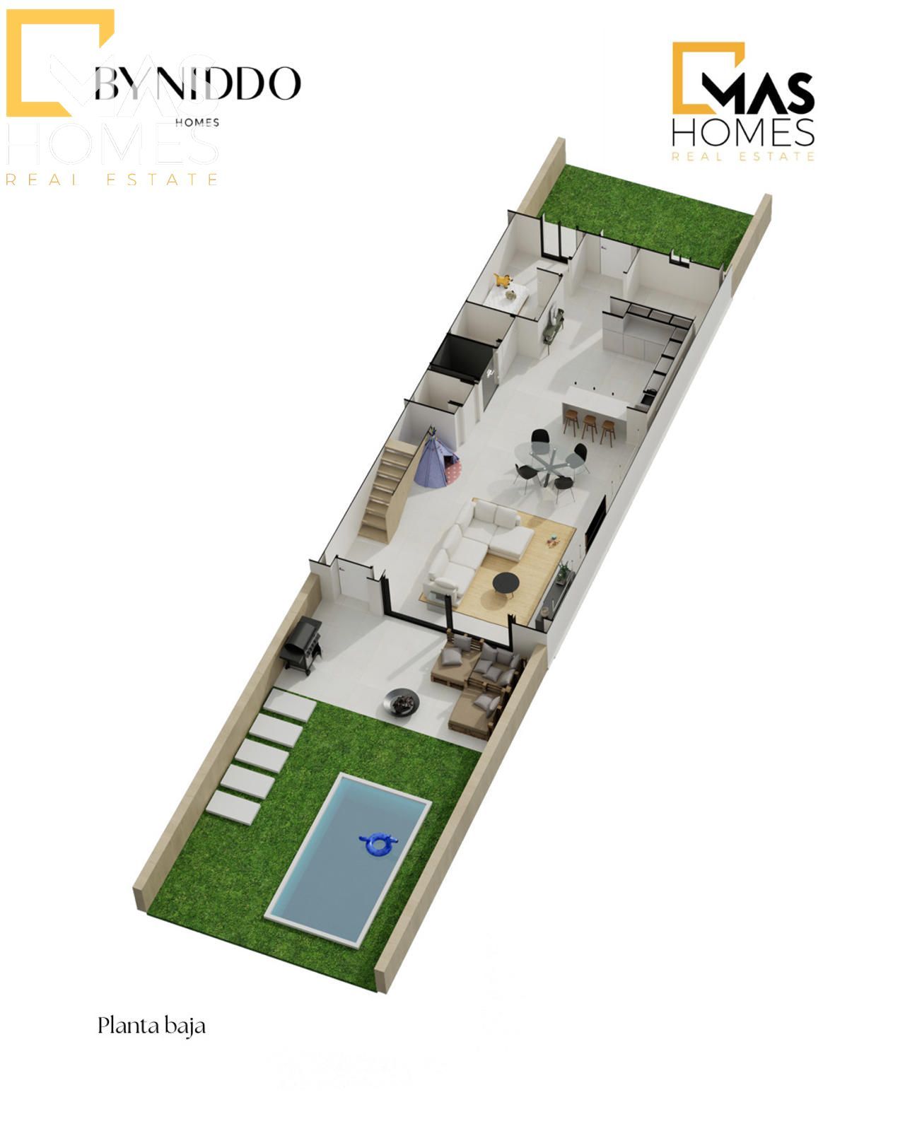 Con superficies construidas desde 268 m², cada vivienda ha sido concebida para ofrecer amplitud, elegancia y funcionalidad. La planta principal recibe con un amplio hall que conduce a un luminoso salón-comedor, abierto al jardín privativo con piscina opcional, generando una transición armónica entre interior y exterior. La cocina tipo office, completamente equipada, combina diseño y practicidad con una cuidada selección de materiales. En esta misma planta se dispone además de un dormitorio individual y un baño completo.